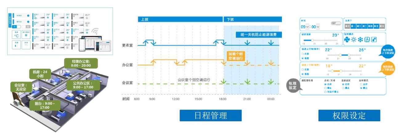 根據(jù)日常使用情況可對(duì)空調(diào)進(jìn)行日程設(shè)定,避免每日手動(dòng)開關(guān)的繁瑣工作,更能有效減免空調(diào)忘關(guān)造成的能源浪費(fèi)。而權(quán)限設(shè)定既可保持靈活的溫度調(diào)節(jié)性,又能防止無關(guān)人員隨意調(diào)控空調(diào)的情況。