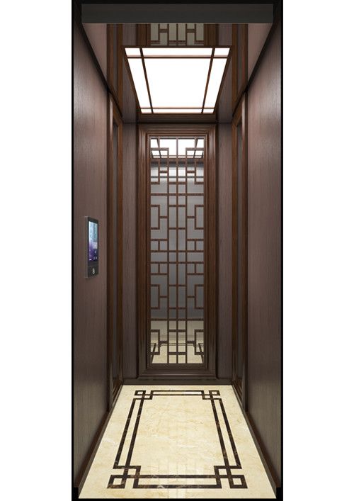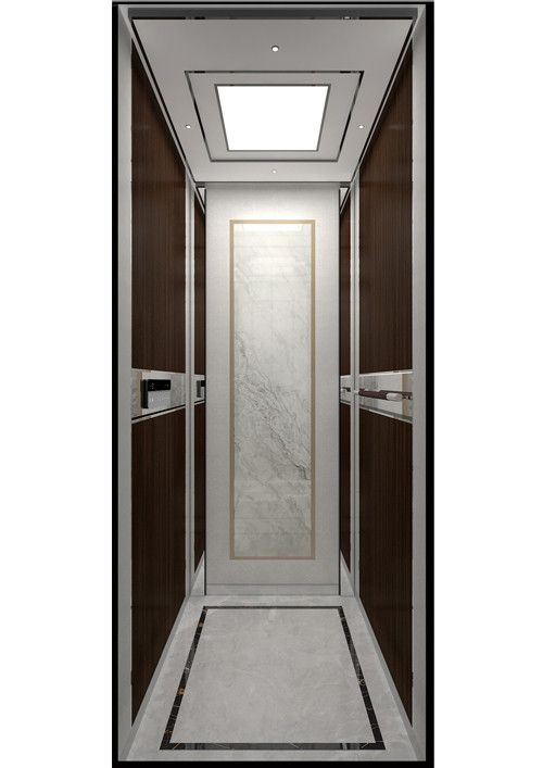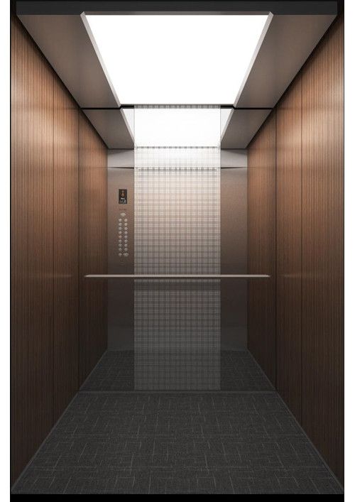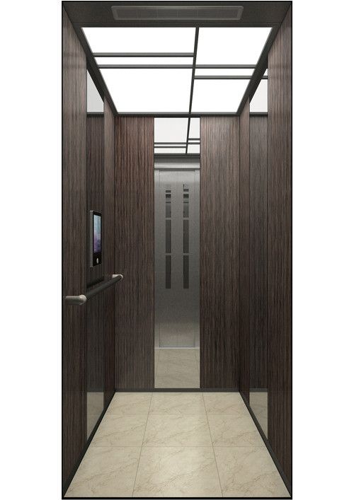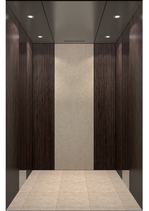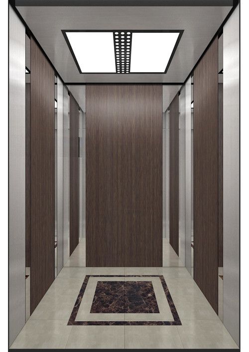 轎廂款型:新自然  天井ECO-ZL,金屬烤漆YM-14(珍珠銀)  前側(cè)板發(fā)紋不銹鋼  門楣發(fā)紋不銹鋼  兩側(cè)彩紋鋼板KB19(棕木)+鏡面不銹鋼  后側(cè)板彩紋鋼板KB19(棕木)+鏡面不銹鋼蝕刻HM-88  轎門發(fā)紋不銹鋼  操作盤BM-T7A1  扶手HR-019(胡桃木)  地板PVC拼花FL-PH15