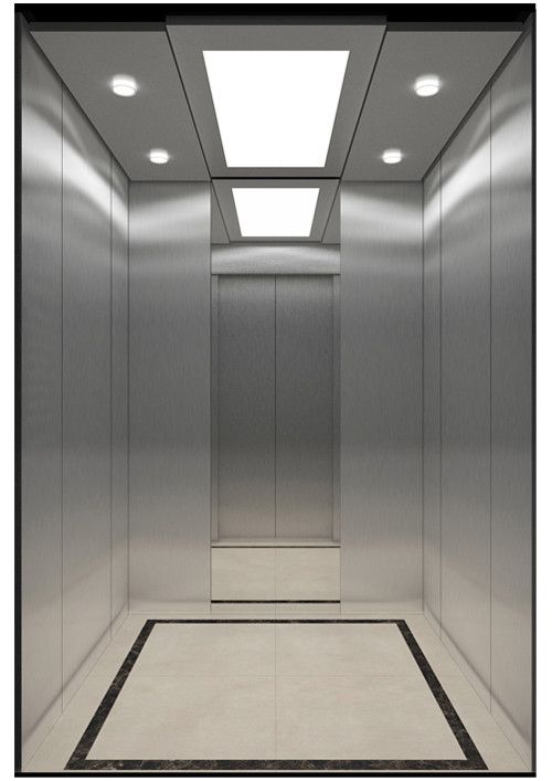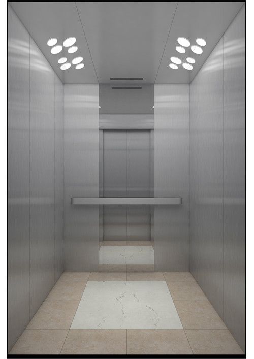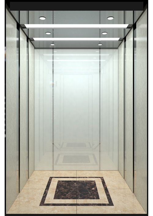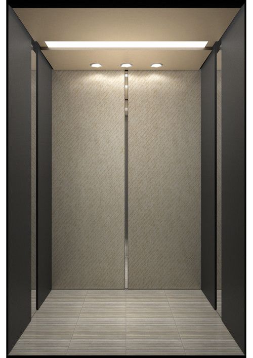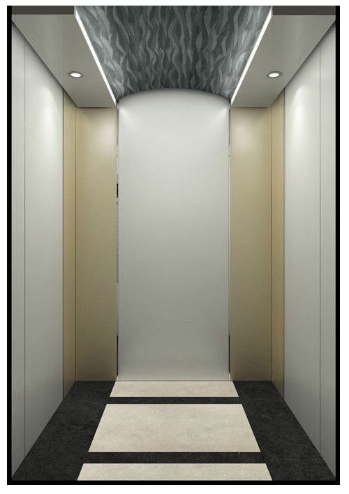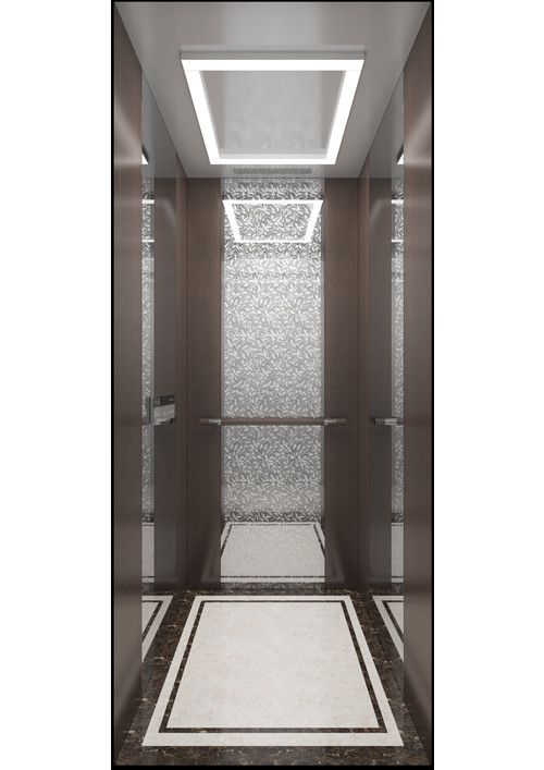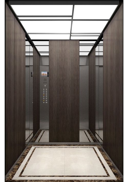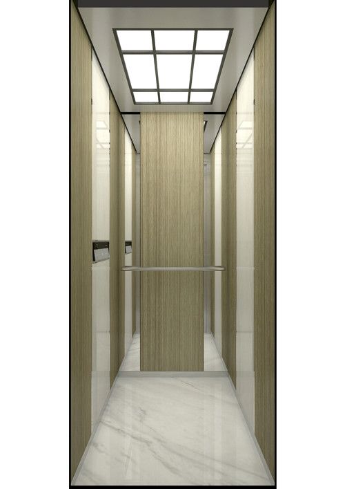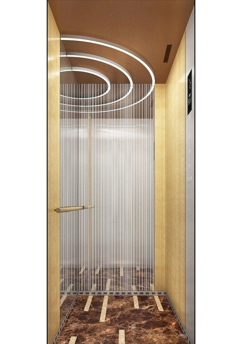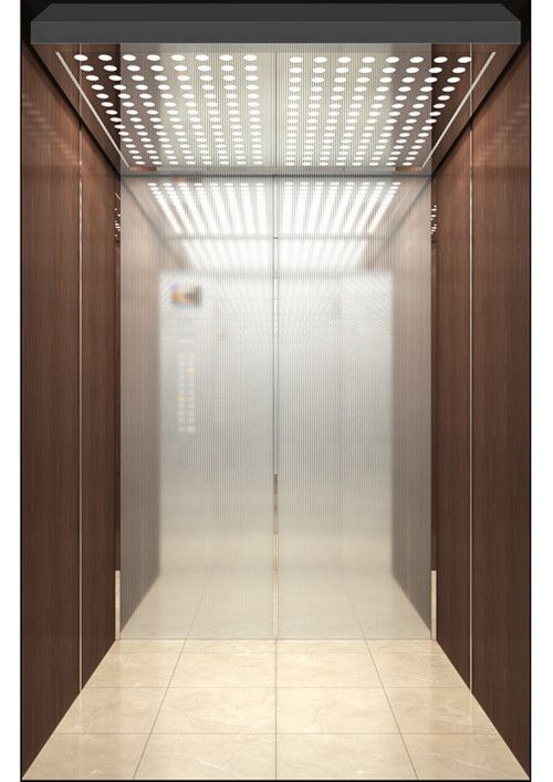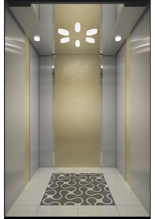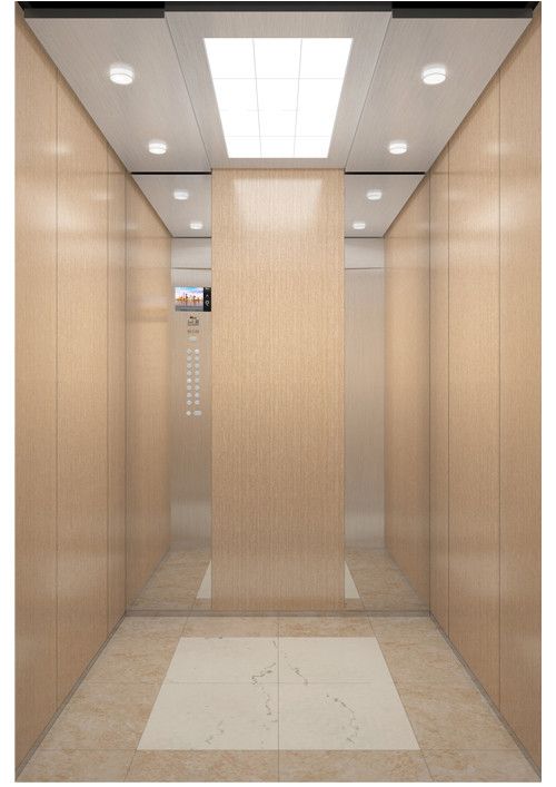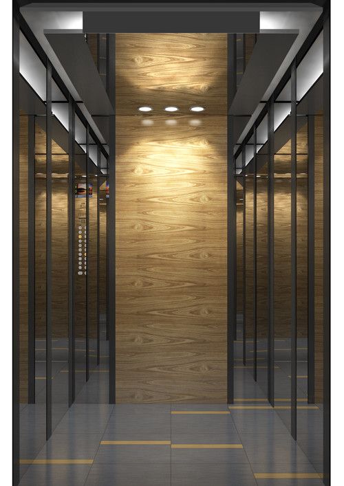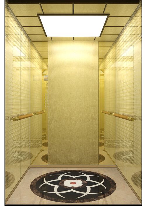 天井:噴砂不銹鋼  后側(cè):彩紋鋼板浮雕木紋+鏡面不銹鋼  左右:彩紋鋼板浮雕木紋+彩紋鋼板大理石紋+鏡面飾條  前側(cè)+轎門:香檳金鏡面  地板:PVC大理石紋