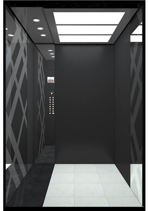 轎廂型號(hào):YT-4690  天井:SKY-PU,軟膜天井  兩側(cè)、后側(cè)板:中間片鏡面不銹鋼,其余鏡面鍍黑鈦  前側(cè)板、門楣:鏡面不銹鋼鍍黑鈦  轎門:鏡面不銹鋼鍍黑鈦  地板:大理石拼花(FL-M14)  操作盤(一體式):BC-P5DT2