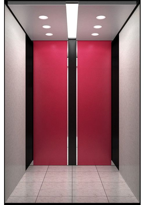 轎廂型號(hào):YG-1624  天井:鉆石銀噴涂鋼板(YG-11)  兩側(cè)、后側(cè)板:兩側(cè)黑色砂紋板(YG-02)+彩紋鋼板(HK-02),后側(cè)紅色砂紋板(YG-03)+黑色砂紋板(YG-02)+彩紋鋼板(HK-02)  前側(cè)板、門楣:緞紋不銹鋼  轎門:緞紋不銹鋼  地板:FL-P40(白色PVC)  操作盤:BD-D2F1