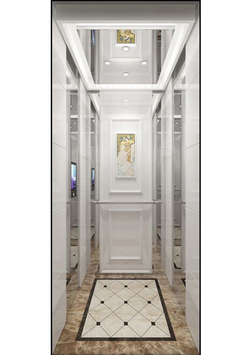 轎廂款型:香榭麗舍  天井ECO-XL,木飾框(亮白)+鏡面不銹鋼  前側(cè)板鏡面不銹鋼  門楣鏡面不銹鋼  兩側(cè)木飾面(亮白)+鏡面不銹鋼  后側(cè)板木飾面(亮白)+鏡面不銹鋼+裝飾畫(選配)  轎門鏡面不銹鋼  操作盤BC-T8A1  扶手皮紋(銀白)+鏡面不銹鋼  地板大理石拼花(西班牙米黃+金鑲玉+水晶啡)